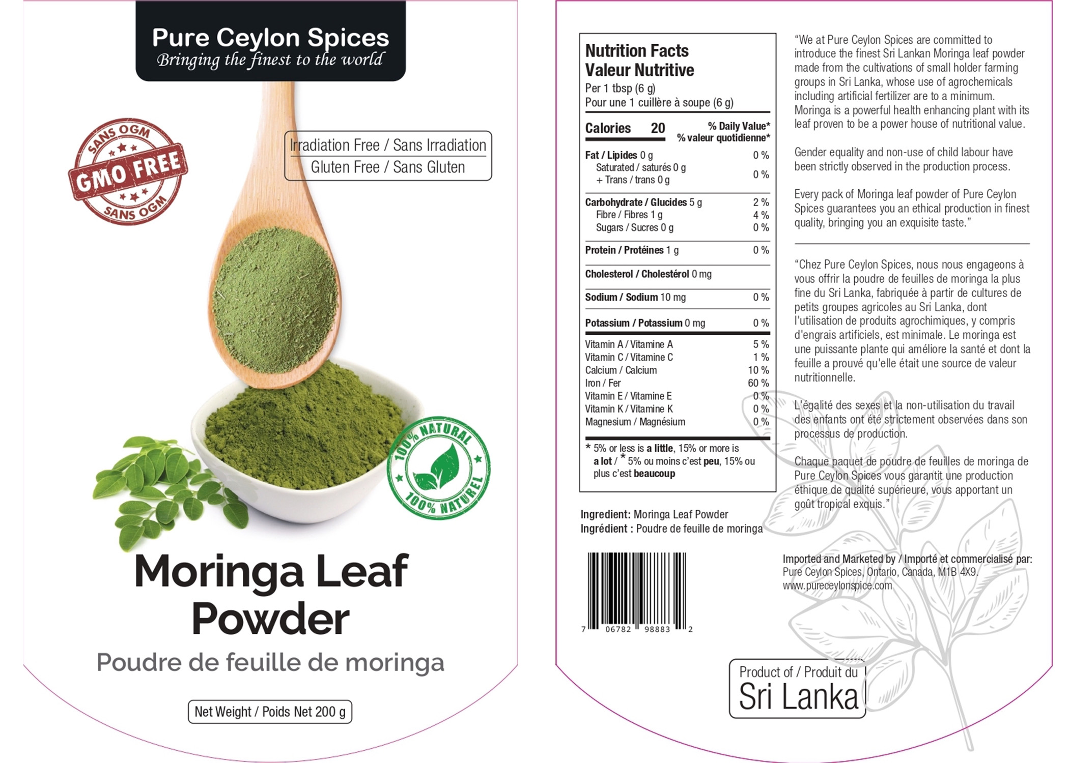 Moringa is a powerful health enhancing plant with its leaf known as a proven power house of nutrition value. Pure Ceylon Spices bring you the finest Moringa Leaf Powder made from naturally grown plants in Sri Lanka.